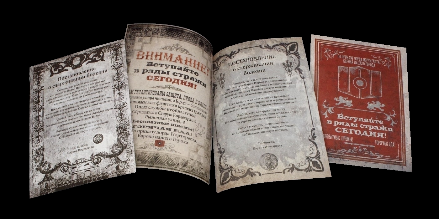 В игре существует огромное количество документов (215), как рукописных, так и отпечатанных типографским способом. Это записки, письма, дневники, записи в журналах, объявления, инструкции, приказы и распоряжения.